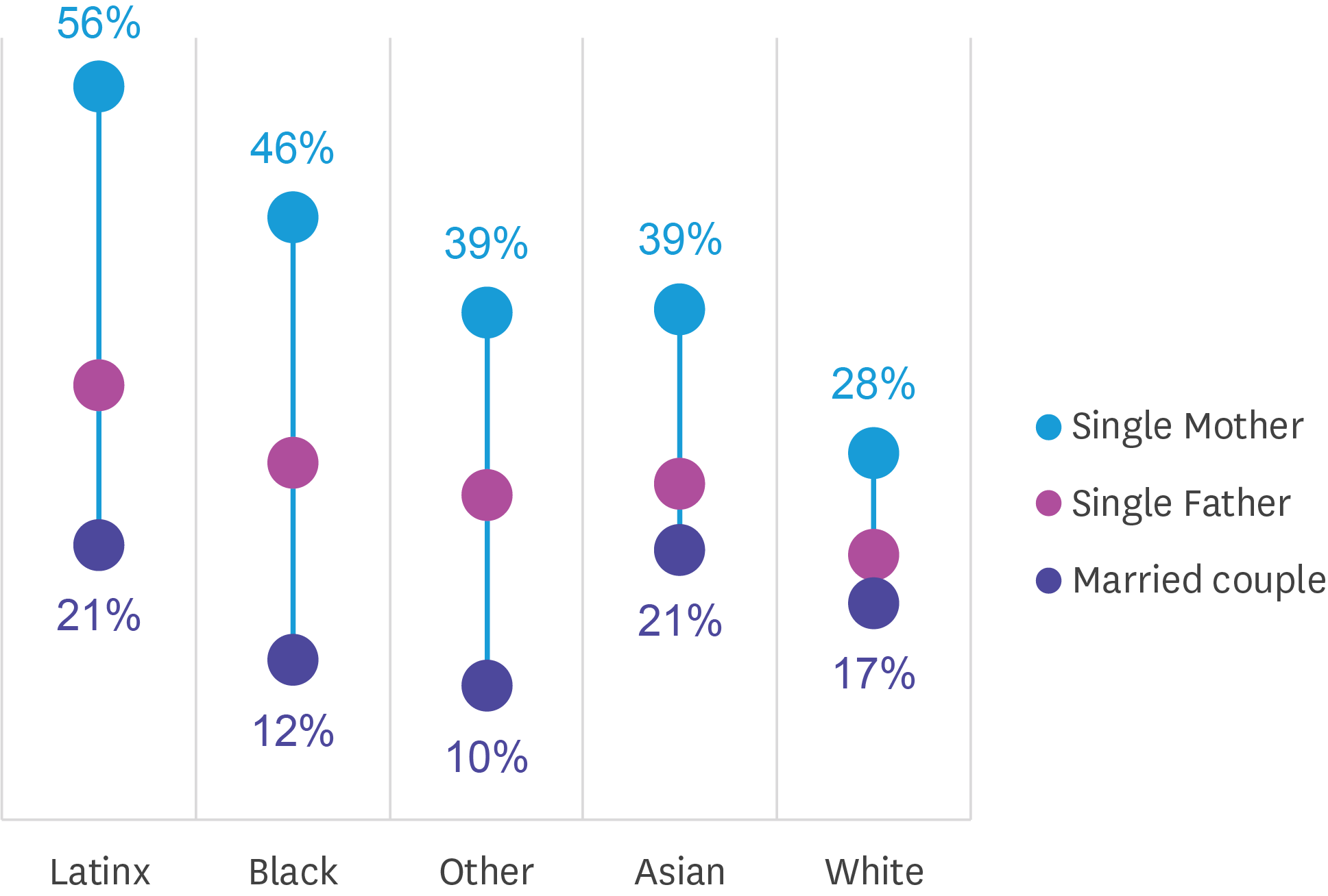 Just 28% of White children of single mothers live in poverty, which is half the rate for Latinx children of single mothers.