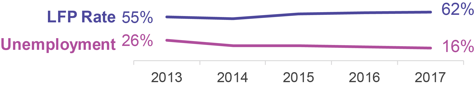 Consistent with trends observed nationally, New York’s single parents are increasingly likely to be in the labor force and employed. From 2013 to 2017, the share of single parents aged 16 and older at work or looking for work (LFP rate) increased seven percentage points. During the same time, the unemployment rate fell to 16 percent.