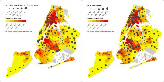 Specifically, our first map presents the enrollment data as a rate per 100 preschoolers in each zip code, overlaid on child poverty rates by zip code. Examining enrollment data as a rate allows us to take into consideration varying child populations across the city. This map demonstrates that Pre-K for All reaches every community across the city with children in communities with high poverty rates benefiting greatly. The second map illustrates the total number of enrollments in NYC pre-k by zip code, again overlaid on child poverty rates. This map illustrates that the majority of the enrollments in pre-k (53.5%) are in zip codes with child poverty rates that exceed the citywide average of 29.4%.