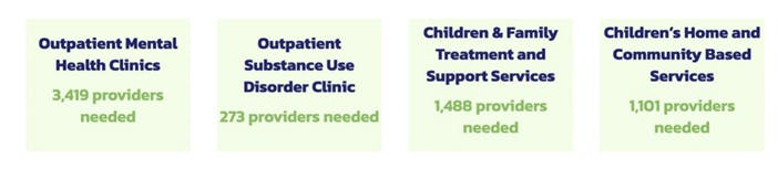Unfortunately, chronically low reimbursement rates have contributed to massive staff turnover and vacancies, and widespread provider shortages. HMHK found that an additional 6,281 providers are needed to address the outpatient workforce shortage. This includes: