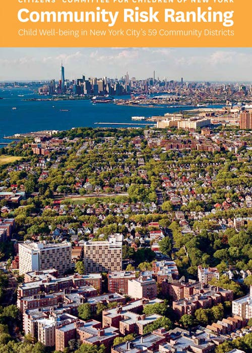 CCC’s Community Risk Ranking combines data from across multiple dimensions of child well-being – economic security, health, housing, education, issues specific to teens and youths, and family and community – to provide a better understanding of where risks to child well-being concentrate across New York City’s 59 community districts. This information can help to determine where additional resources, supports or services are needed to improve outcomes for children.