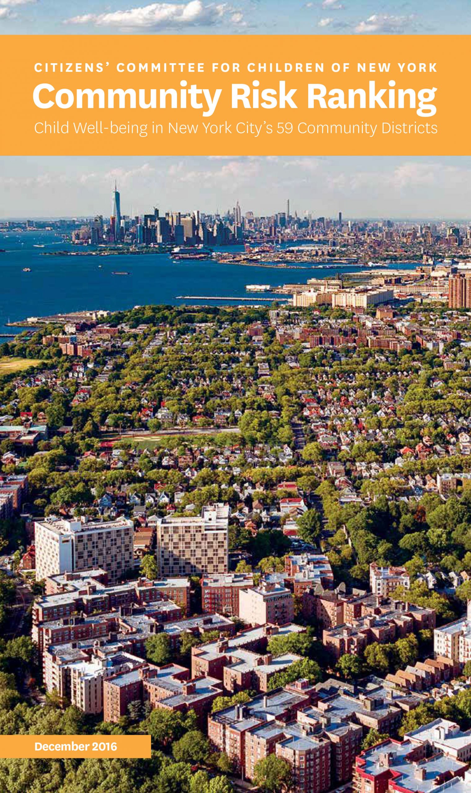 CCC’s Community Risk Ranking combines data from across multiple dimensions of child well-being – economic security, health, housing, education, issues specific to teens and youths, and family and community – to provide a better understanding of where risks to child well-being concentrate across New York City’s 59 community districts. This information can help to determine where additional resources, supports or services are needed to improve outcomes for children.