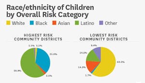 “Given that black and Latino children constitute 58% of the city’s child population, their stark overrepresentation in the highest-risk communities is alarming,” said CCC Executive Director Jennifer March. “These statistics point to a need to ensure that communities with high populations of black and Latino families have adequate access to the services and supports that have proven time and again to help break the cycle of poverty and improve outcomes for children.”